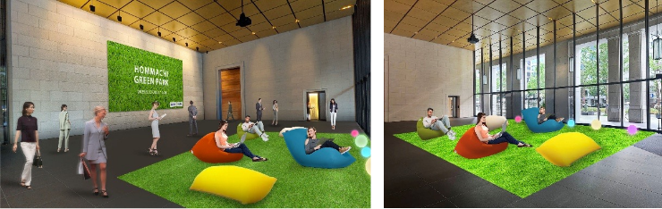 1階エントランス空間を緑の空間として芝生を敷き、その上には魔法のビーズソファとして人気のYogiboを配置。ビジネス街でのリフレッシュができる憩いの場として空間を彩りました。